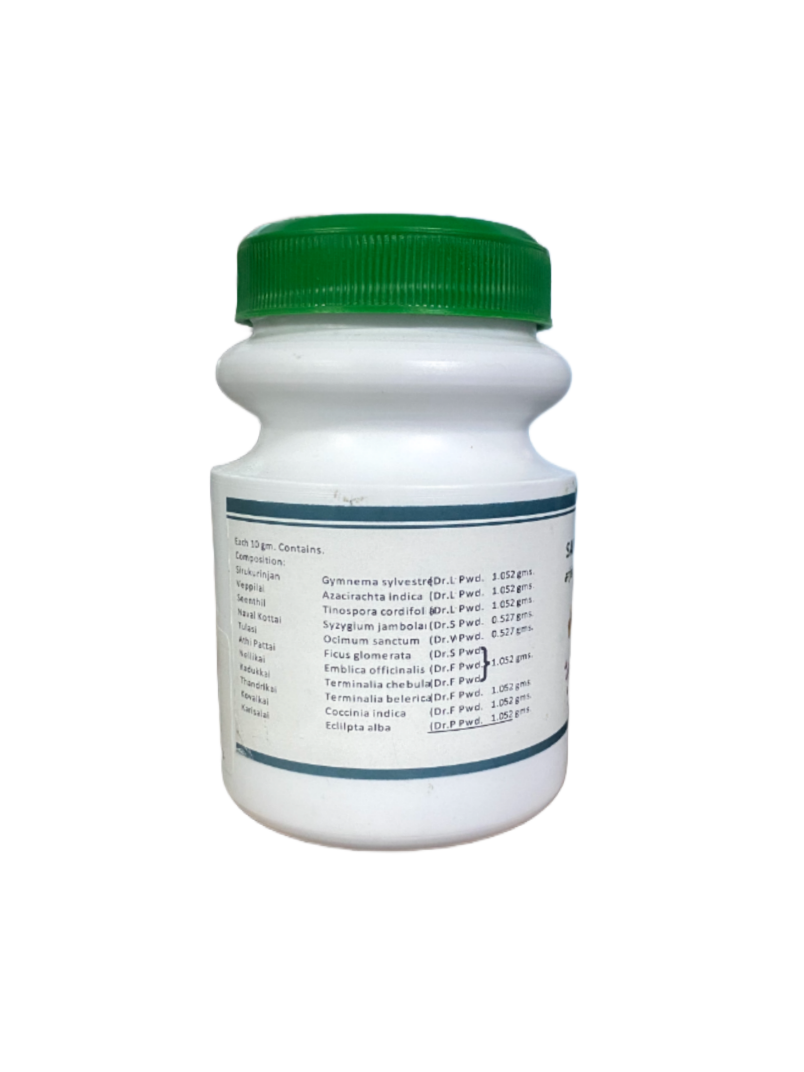 SK Chooranam is made with the Composition Of Gymnema  Sylvestre, Azacirachata Indica, Tinospora Cordifolia, Syzygium Jambolanu, Ocimum Sanctum, Ficus Glomerata, Emblica Officinalis, etc,. to helps to promote Diabetic Care.